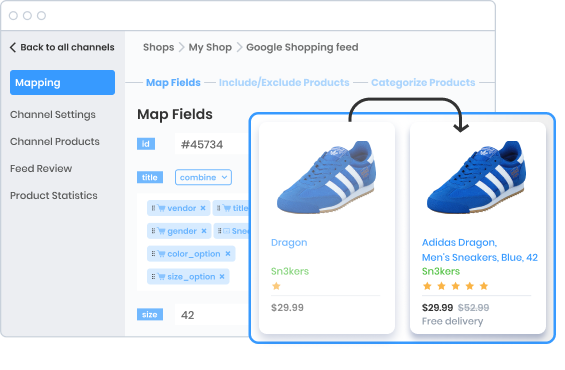 Verwalten Sie alle Ihre Datenfeeds auf einer Plattform. Alle Kanalanforderungen sind vordefiniert, sodass Ihre Datenfeedsautomatisch im richtigen Format generiert werden.
