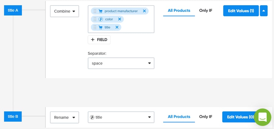 Wenn Sie eine umfassende Analyse Ihrer Berichte, vertikalen und Produkttypen durchgeführt haben, können Sie die relevantesten Attribute in Ihrem Titel kombinieren. In DataFeedWatch kann dies mit Hilfe von regelbasiertem Mapping schnell geschehen.