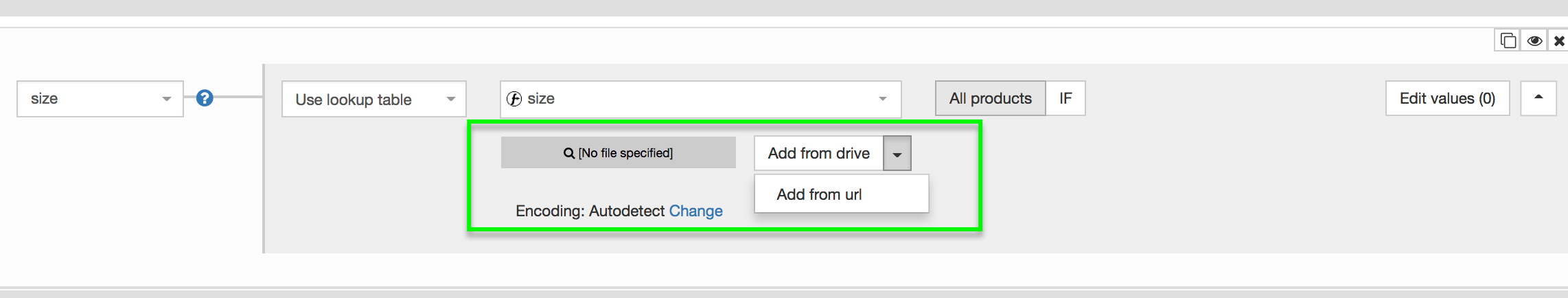3. Laden Sie das .csv-Dokument von Ihrem Computer hoch oder geben Sie die URL des Google Spreadsheets an und speichern Sie alles. Das neue Feld wird die standardisierten Größen haben statt der ursprünglichen.