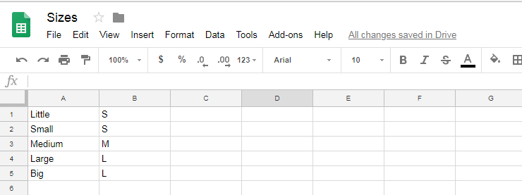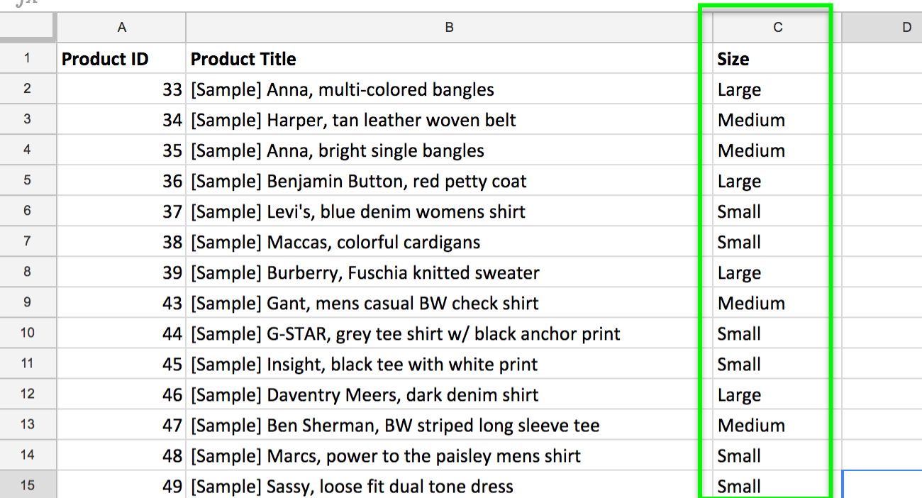 Nehmen wir an, dass die Größe in Ihrem Quellfeed aktuell als „klein, mittel und groß“ definiert ist.